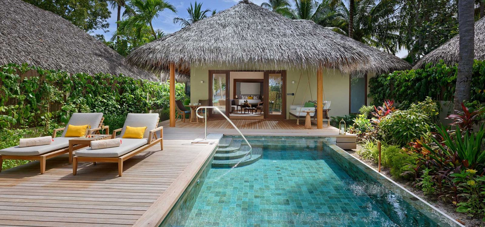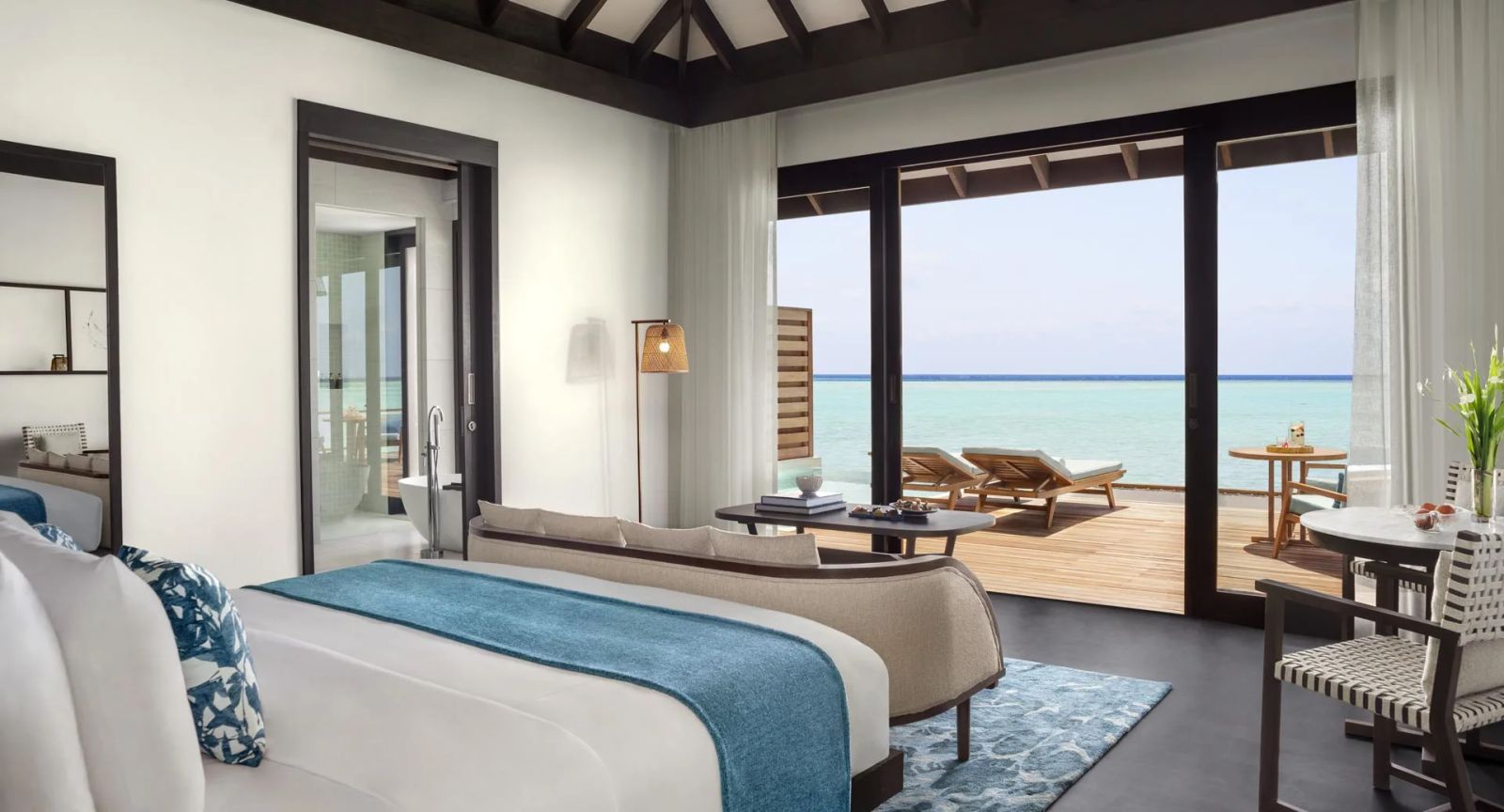 Most accommodation sits above the water, with bungalows placed for privacy and open views. Interiors use natural materials and calm colours. Beds face the horizon, terraces have steps to the lagoon, and some categories add a plunge pool for quiet swims in complete seclusion. It feels airy and restful rather than formal, with thoughtful touches that make days flow without effort.