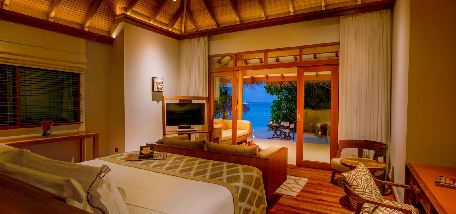 Villas are scattered along the beach or built overwater, blending natural wood, thatch and modern comfort. Each provides seclusion, with terraces or decks to watch sunsets and sea life. Interiors are simple and elegant, designed to encourage relaxation.