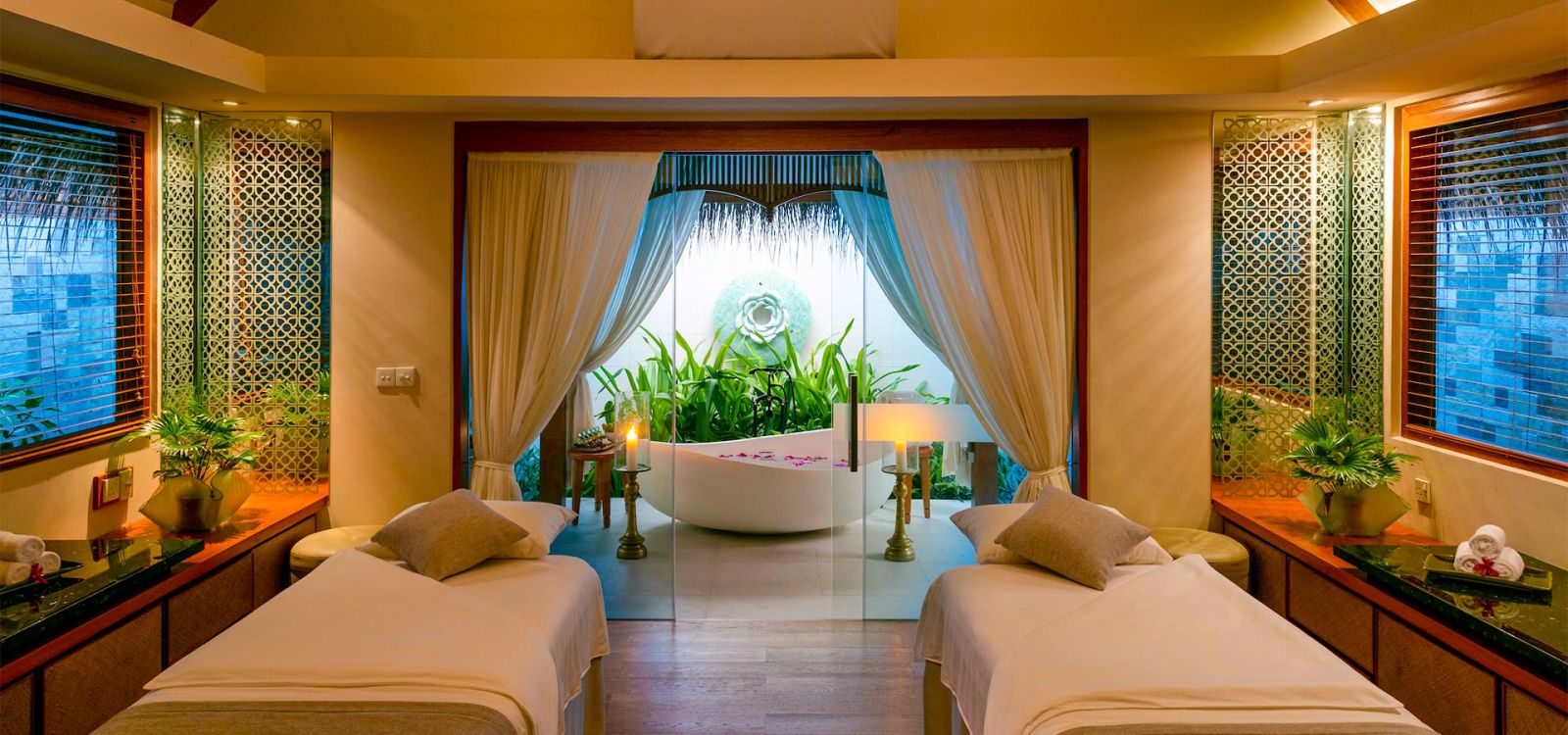 Wellness is woven into the experience. The Spa by Thalgo France is one of the largest in the Maldives, with over one hundred and sixty treatments available. Set among tropical gardens, its thatched pavilions create a peaceful retreat. Couples can share treatments in private suites, while yoga and meditation spaces look out onto calming views. A modern fitness centre, tennis courts, and water sports complete the balance of activity and relaxation, giving guests the choice to energise or unwind as they wish.